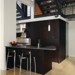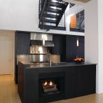 The kitchen’s dark-stained riff-cut oak cabinets conceal all of the appliances except for a gourmet cooking range and hood. A matching, furniture-like island—bisected by a structural column that once separated the two units—holds a fireplace and media cabinet on one side and casual bar seating on the other.