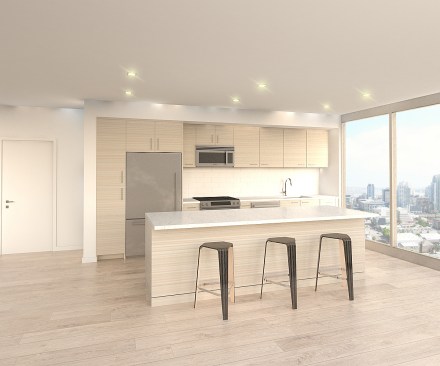 Residences will include studio and one-, two- and three-bedroom floor plans, as well as penthouse suites, with square footage spanning from 518 to 2,824 square feet. The homes are designed in a classic, modern feel, fitted with plank flooring, private patios or balconies, stainless steel appliances, quartz countertops, polished chrome fixtures and full-size washer/dryers. Rents will start at $1,705.