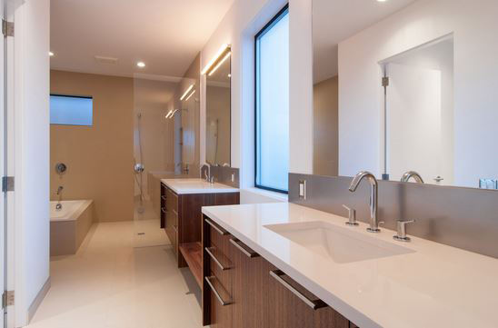 More than ever, residential bathrooms are substituting bathtubs for the practicality and sensibility of walk-in showers. Along with this shift comes a greater emphasis on the detailing of showers. And when it comes to design that is authentic to our time, (also known as modernism), this often leads to smarter, more attenuated design solutions. One of the most satisfying details we’ve developed for bathrooms lately is the curbless shower. Under the right circumstances, and with some thoughtful planning, the curb can be eliminated without reducing the functionality of a shower. (All images by Build LLC.)