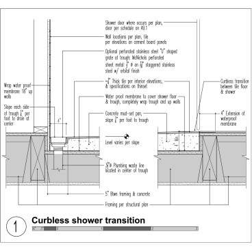 The primary move is a structural drop in the floor framing to accommodate the shower slope. This change in floor framing (or slab in some conditions) should be considered early on in the project so that the appropriate information can be coordinated with the structural engineer.