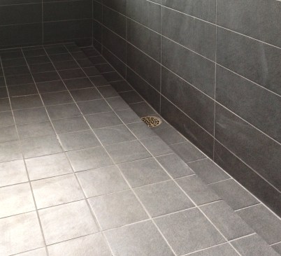 We’ll typically include a slight valley down the middle to center the water on its way to the trough. The trough is also sloped in both directions (and perpendicular to the shower slope) to direct water to the drain line in the center. Because the floor slopes are large and orthogonal, the tiles don’t need to be cut into funny little 45 degree angles (a pet peeve of ours).