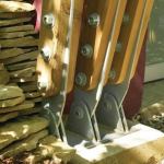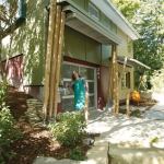Klement’s design echoes the house’s main curvilinear roof. The awning is made of a telescoping nesting array of curved metal roof segments supported on metal frames and attached to articulating structural posts fabricated from recycled telephone poles. The entire assembly is easily raised and lowered using a manual hand crank