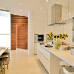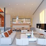 Chin razed the cottage, and in its place he nestled a 6,000-square-foot home set on 100 piles driven into the sandy soil. He organized the home on three levels: a ground floor with a family room, four Jack and Jill bedrooms, and a powder room; a second level containing the kitchen, dining room, and living room; and a mezzanine for the master suite. “The neighborhood has a height restriction of 32 feet,” Chin says. “The mezzanine allowed us space to insert a full bath and the master bedroom.”
