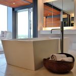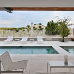 Despite the home’s modernist/industrial take on the beach house, the spaces are warm and informal. Chin chose materials such as Douglas fir, oak, cedar, and pebble-tiled walls in the master bath to add not only warmth but texture. And the large glass doors upstairs and down make outdoor living easy. For the family of five who entertains at the house almost every weekend, the home is the perfect respite from the hectic pace of life in Gotham, a place to soak up the sand and the sun or swim in the backyard pool. Says Chin, “It’s modern and exciting, but it’s comfortable for entertaining.”