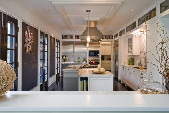 The centerpiece of the room is a muscular island incorporating an industrial-strength range, plenty of storage, and a raised stainless “bistro-style” bar for taste-testers. French doors overlooking a vegetable garden and outdoor dining terrace are interspersed with slate panels, upon which shopping lists and menus are routinely updated in chalk.