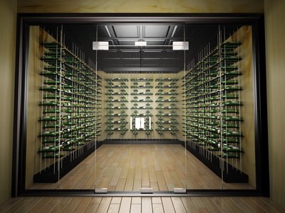 The design’s most distinctive feature is its “floating” floor-to-ceiling racks. A series of metal uprights support the rack’s individual wood platforms, which are positioned to create the illusion that the client’s wine collection is floating in midair. This effect is particularly striking in a glass-enclosed wine room, and optional clear acrylic bottle supports can enhance the illusion further.