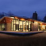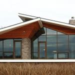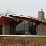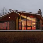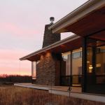 Given the wide open site—prairie on one side, woods on the other—the owners wanted big, long roof planes. But concerns about budget and snow loads prevented building a modern flat roof. Instead, Stephens opted for as low a slope as he could manage “without making the house look like a 1970s ranch,” he says. He designed the roof around a traditional truss that can take on different angles throughout the house but still be built inexpensively. The overhang along the southwest side is almost 6 feet—beautiful and practical protection from the sun. “Turning the soffits up was a way to make the roof lighter and get the feel of a flat roof,” he notes, while the cedar warms up what’s essentially a glass box. The house looks like it’s about to take flight; it also appears to float thanks to the cantilevered porch.
