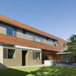 To maximize light play, walls and ceilings were painted white and concrete floors were impregnated with orange-brown tones. Even the copper rain chains—a necessity because of the roof lines and soffits—add warmth, playing off the streamlined exterior.
