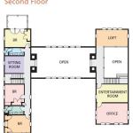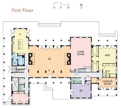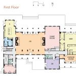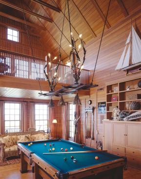 The two parallel, flanking wings open onto the great room, like separate buildings onto an interior courtyard. The east wing holds kitchen and service spaces at the first floor and a suite of children’s rooms above. Knowing that guests tend to congregate in the kitchen, and not wanting to waste all the effort he had invested in the great room, Silk devised the kitchen as a subtle means of behavior modification. To make the room comfortable for the family but less inviting for larger groups, he said, “Let’s squeeze this space as much as we can. Let’s not put a TV in there.” The west wing sweetens the deal for party guests with an expansive game room at the first floor. A second stair reaches a private media room, a home office, and a loft-like seating area that overlooks the game room. The second-floor areas of the two-story wings are not contiguous, but Silk cut a window into each chimney and dropped the bottom chord of the trusses to create a balcony view over the great room from end to end. The master bedroom suite occupies its own annex at the westernmost end of the house.