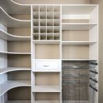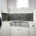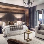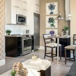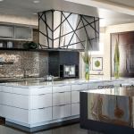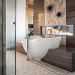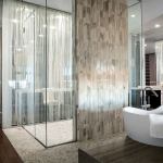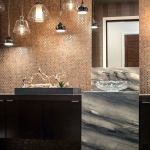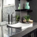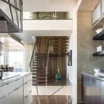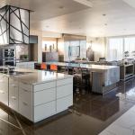 Visitors are guided from the front door through the two-level atrium to the home’s core via a center-access “runway” made of large-format Daltile porcelain tile. To balance out the cavernous space, designers scaled down the volume in the living room and kitchen by dropping the ceiling height from 23 feet to 10 feet. They also broke up large expanses of materials such as wood and tile with showy accent pieces.