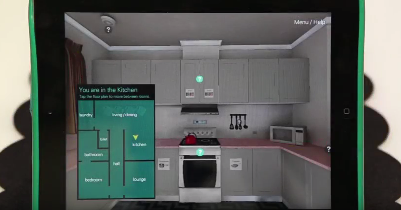The Dementia-Friendly Home uses a 3D model home in which users can navigate through a floorplan. As users move through the rooms, little question marks pop up demonstrating one of ten principles of a dementia-friendly environment developed by researchers at Australia’s University of Wollongong.