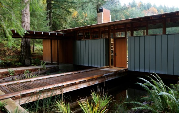 Jim Cutler of Bainbridge Island, Wash.–based Cutler Anderson Architects first saw the site for this single-family residence in Newberg, Ore., when the clients were still planning to build their new home on a wooded hilltop on their farm in Oregon’s wine-growing region. On his visit, Cutler wanted to see more of the land and kept walking until, “I saw a glint of light,” he says. Following that twinkle, he found a scenic opening in the forest where loggers had mostly filled in an old bog, which prompted him to ask: “How about here?” What had been a contest between several firms became Cutler’s commission. The resulting, 1,440-square-foot residence comfortably houses the couple, and a 550-square-foot guesthouse on the site accommodates visitors.