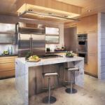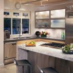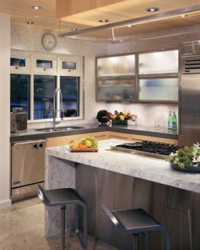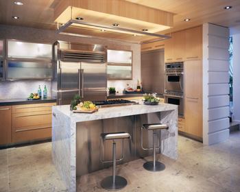 At 150 square feet, the new kitchen is modest in size but rich in appointments. Special touches in and around the island include a marble top that wraps to the floor around steel kick panels; a suspended cable light fixture fabricated to match the exact dimensions of the island below; and a custom downdraft. The perimeter counters are beveled at a 45-degree angle on the edge detail.
