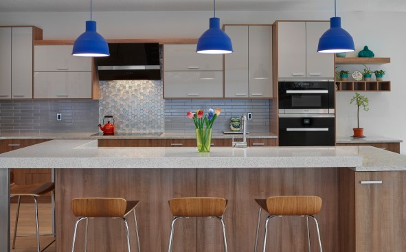 Conceived as a contemporary take on the iconic Case Study houses, the Vali Homes infill prototype 2.0 was designed by Tempe, Ariz.–based CoLab Studio, and built by 180 Degrees, for Phoenix’s middle-income market. Inside, white gypsum board ceilings and walls, along with white kitchen cabinets, bounce daylight deep into the home and reduce the need for artificial lighting, and wood accents bring warmth to the space. Advanced framing techniques reduced lumber usage for the home by 20%, while also reducing heat transfer and allowing for more insulation. The LEED Platinum design can also be net-positive energy with the installation of a solar photovoltaic system.