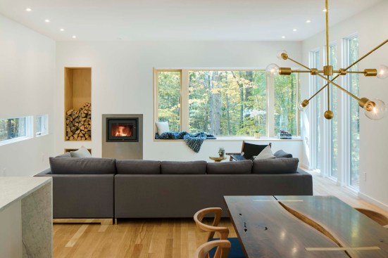 For the ‘High House’, Delordinaire plays with the limit between interior and exterior, inviting people to gather in spaces immersed in nature. Elevated stilt constructions are typically used in warm climates and flood zones. This energy efficient winter chalet uses stilt typology to create a protected ground floor area with an outdoor stove. Providing an unusual space where residents can be amongst nature and the snowy exterior, while still enjoying some protection from the elements.The stilt typology raises the house above the surrounding tree line giving it an uninterrupted view of the Mont Saint Anne from the lounge, as well as a striking overall aesthetic. It also allows sunshine to directly enter the house at all hours of the day.