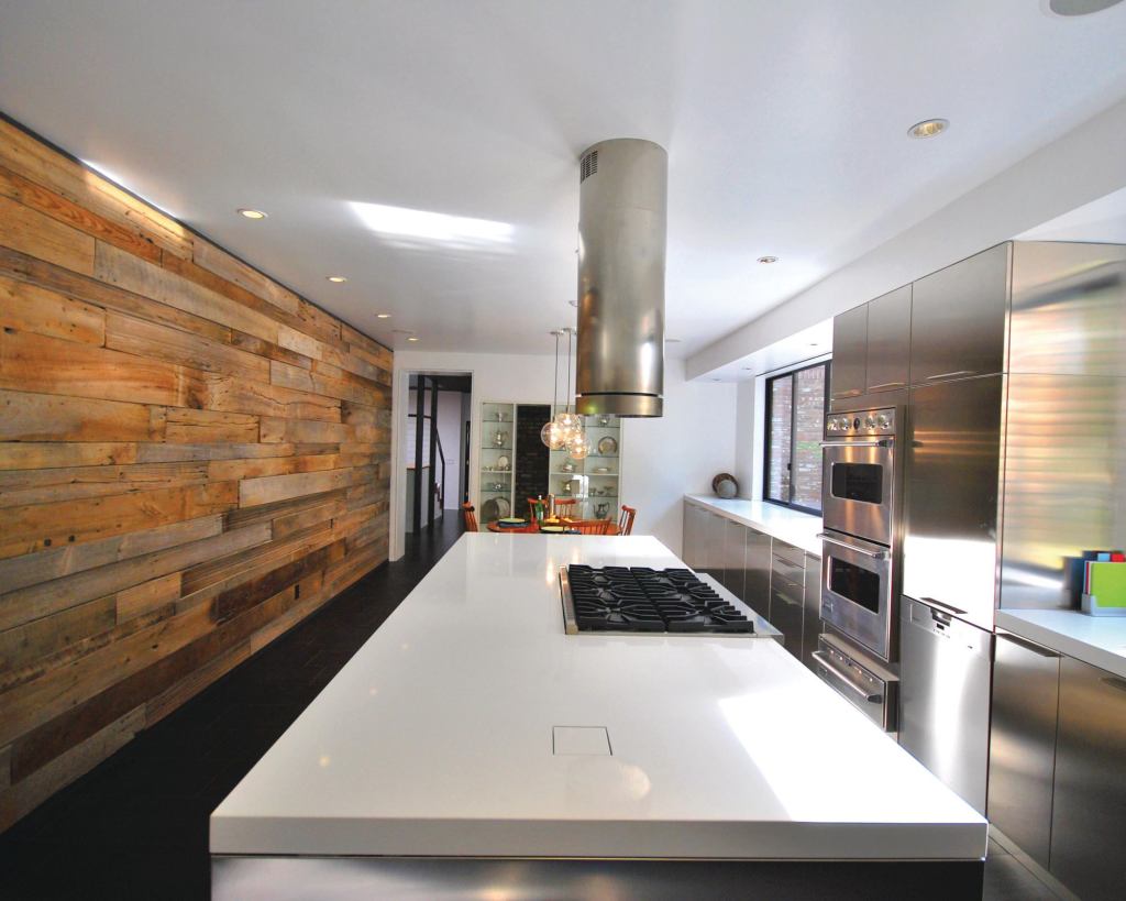 The homeowners are serious cooks who sought surfaces that were low-maintenance—no paint or veneer. They chose stainless steel cabinetry, porcelain stoneware floor tiles, and a quartzite top for the kitchen island. Finally, to warm up what could have been a sterile room, an entire wall was covered with reclaimed barnwood, playing rustic against modern.