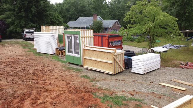 Once a design is finalized, components are fabricated at the two factories with which Cohen has contracted. Wall panels consist of a 2×4 frame, insulated, sheathed, air-sealed, and covered with 6 inches of additional rigid insulation. To produce a building envelope that will meet the Passive House standard of 0.6 air changes per hour at 50 Pa of pressure, panels are joined on site with an expanding foam gasket (for vertical connections) and liquid-applied sealant (for horizontal joints).