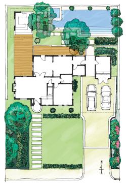 The remodel designed by architect Jay Corder expanded the house and solved the outdoor dilemma. His scheme for a two-story addition occupies the side yard, confining the driveway to the front of the lot. On the ground level, the addition forms a breezeway that keeps the house from appearing monolithic and that links the front parking pad to the rear yard. That freed the entire 67-foot-wide backyard for the kind of outdoor spaces the clients needed for casual entertaining.