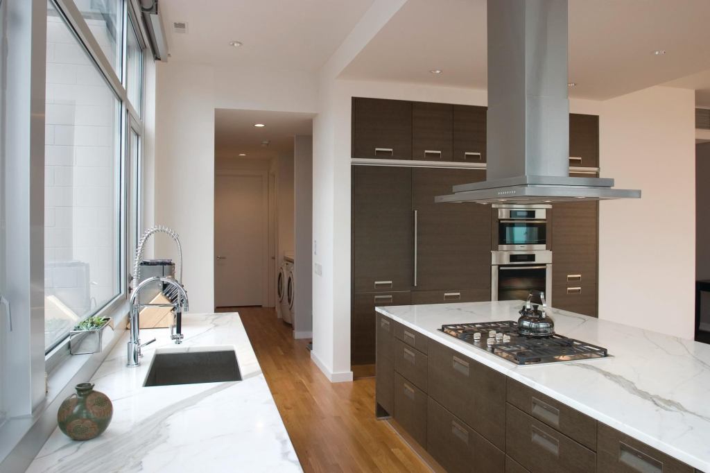 Foreground considerations were important, too, and on this matter the team had to concoct a design that integrated nicely with the building’s exterior perimeter steel and glass frame—a defining structural characteristic that was visible just outside the windows. The marble-topped sink counter, island, and steel vent hood achieve this so nicely that it almost appears as though the building’s deck grid has passed through the glass to become part of the interior space.