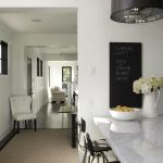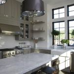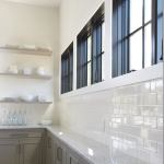 Cabinets painted gray update the scullery theme, along with open shelving, contrasting dark window frames, and polished nickel hardware. Thanks to clerestory windows set above work surfaces, natural light spills onto the Carrera marble countertops and bounces off glossy white subway tiles that line the backsplash and extend to the ceiling.