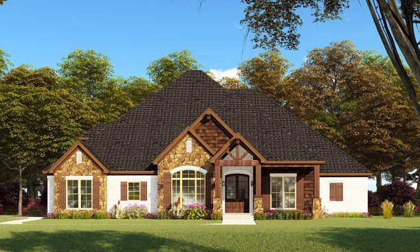Now that’s a kitchen island! Up to ten people can hang out in this home’s central cooking area, making it the undisputed hangout spot in the home (and doesn’t everyone end up there anyway?). Other highlights include the master suite’s huge closet, a fireplace-warmed grilling porch, and Craftsman details on the rugged exterior. See more images, information, and the floor plans.