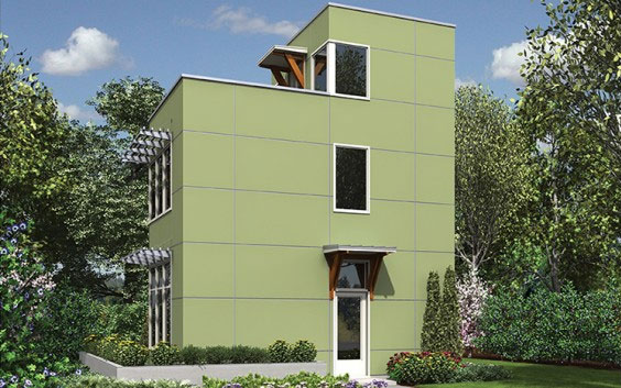 This outstanding small plan is a great pick for a compact lot, especially with a rooftop deck that invites outdoor living. The open layout takes advantage of every square foot. Windows bring light into the staircase for a bright trip upstairs. On the main level, the kitchen overlooks the living room, where corner windows are a sleek touch. The bedroom level shows off more corner windows, plus laundry where you want it (in the bathroom!) and a handy linen closet. Up a level, there’s room for a guest bed. Step out to the deck to relax outside. See more images, information, and floor plan.