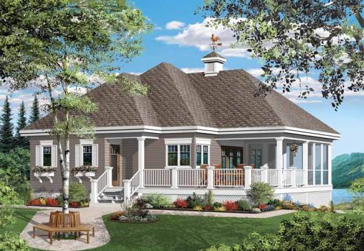 Despite its modest size (1,070 square feet), this beautiful home is full of upscale details that would make it a great vacation spot for a Boomer on the cusp of retirement. Wraparound and screened porches take advantage of the view in all kinds of weather. The kitchen displays a curving island with a cooktop and a snack bar. This area flows without interruption into the open dining room and then the great room. The bathroom boasts both a corner tub and a separate shower. An unfinished basement offers room for storage or future expansion. See more images, information, and the floor plan.