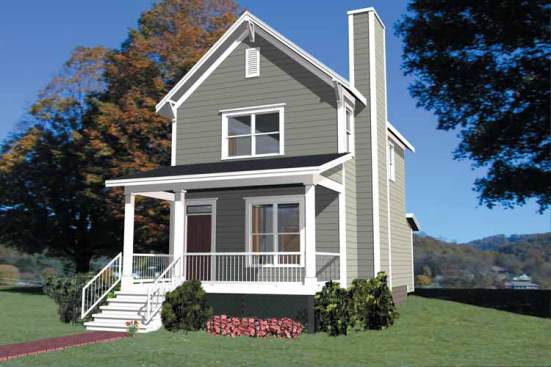 Just 18 feet wide, this 1,042-square-foot home is a great choice for a narrow lot. A front porch adds neighborhood-friendly curb appeal and a place to relax outside. On the first floor, the island kitchen will be the center of activity, with the living room on one side (the fireplace is a nice touch) and the dining space and powder bath on the other. Upstairs, the master suite boasts a walk-in closet and a private bath. A second bedroom suite offers all kinds of possibilities: guest lodging, a home office, or perhaps a nursery. See more images, information, and the floor plan.