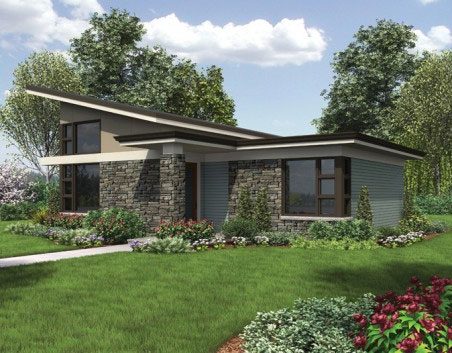 Clean-lined and cool, this modern design features an open layout that feels both relaxed and luxurious. The main gathering areas revolve around the kitchen, where a huge island will become the preferred hangout spot. A guest bedroom and full bathroom are tucked away in the back right corner, close enough to the rec room to use it as a private living space if desired (especially welcome for an elderly live-in relative to enjoy some independence). See more images, information, and the floor plans.