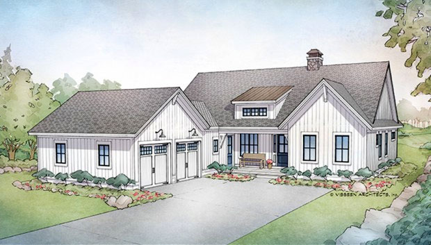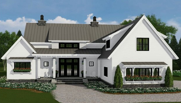 These home designs stand out. Look for modern farmhouse exteriors, social kitchens, in-law suites, innovative storage, and spa-like master bathrooms.