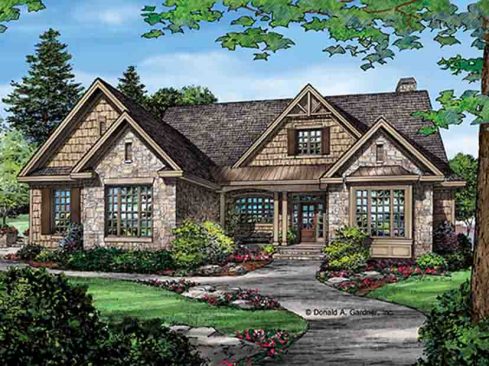 with stone and columns, and varying rooflines add a custom look to the facade.