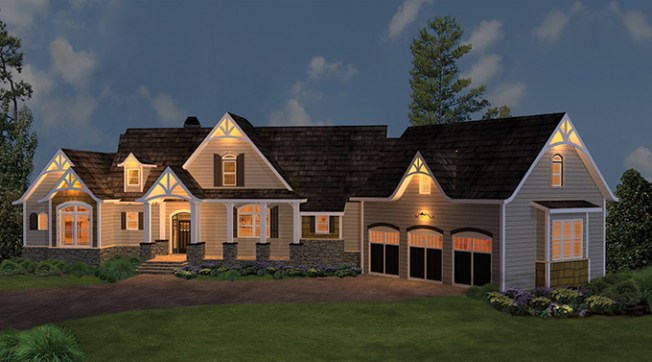 All three bedrooms access the extensive outdoor living (including two patios, a terrace, and a porch) in the back of this impressive home. An optional fireplace on one of the patios warms up the night. Highlights of the interior include the kitchen’s substantial island, the master suite’s jaw-dropping bathroom (don’t miss the back-to-back vanities and the central tub), and a large laundry room. Two separate bonus spaces upstairs include a full guest apartment with a kitchen over the garage and another bedroom suite in the main house. See more images, information, and the floor plan.