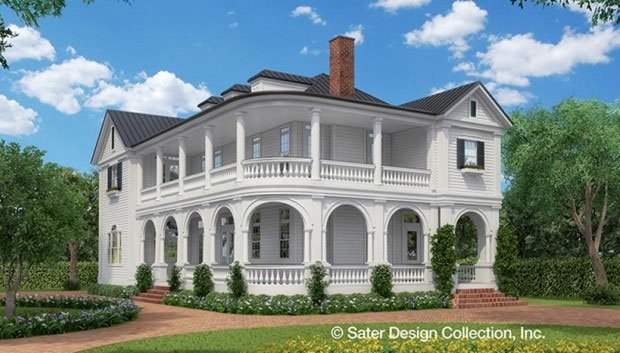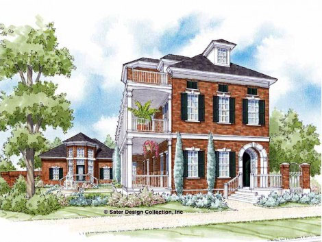 Influenced by traditional Charleston style, this narrow-lot home displays two levels of graceful porches and a contemporary open layout inside. Tucked away in back, the garage doesn’t interfere with the striking curb appeal of the front and side elevations. Inside, the great room flows into the dining room, where two sets of French doors open this area to fresh breezes. A generous island anchors the kitchen, with a walk-in pantry at hand. An elevator makes it easy to get upstairs, where three bedrooms and a bonus suite host family and guests. The master suite includes a spacious bathroom with a walk-in shower and two sinks. In the master bedroom, a fireplace adds cozy ambiance and doors to the wrapping balcony invite homeowners to step outside. See more images, information, and the floor plan.