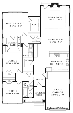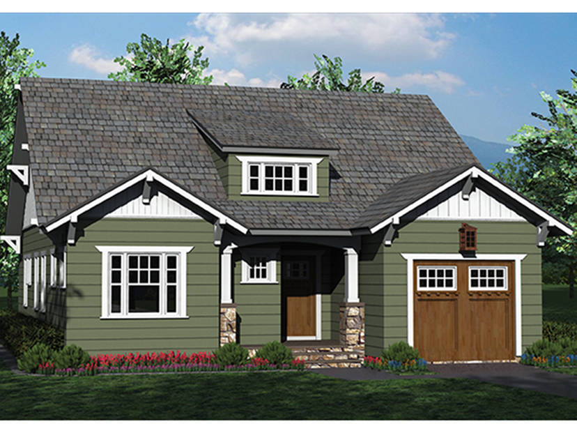 Car ownership isn’t a huge priority for Millennials, so the single garage shouldn’t be a deal-breaker for this smart design. Just 38 feet wide, the layout is a good fit for a narrow urban lot. The super-open kitchen and great room encourage easy entertaining. Located at a comfortable distance away from the private master suite, two secondary bedrooms offer room for guests, working from home (especially the bright, front-facing room), or children. See more images and information.