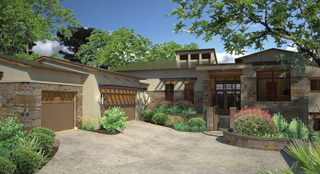 awnings add contemporary appeal to the warm stone-and-stucco facade of this plan.