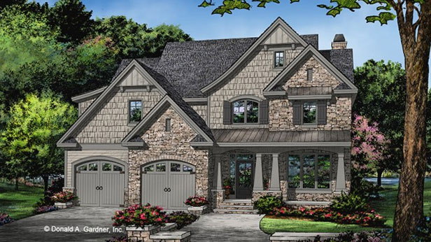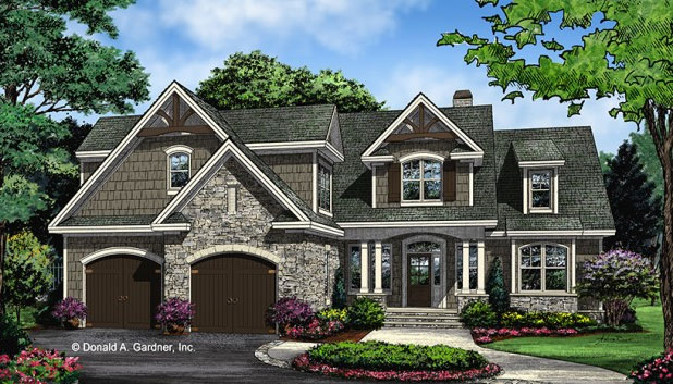 Rugged and eye-catching, this exterior combines stone with shingle and decorative trusses to bold effect on this 2,370-square-foot design. Separate bays break up the expanse of the two-car garage, along with carriage-style doors. Families will enjoy the spaciousness of the kitchen, where the island holds the range for easy interaction with guests while cooking. The master suite is easy to reach on this level and gives each partner a separate vanity. Upstairs, two more bedrooms share a hall bath, where double sinks make it easy for kids to get ready at the same time. See more images, information, and the floor plans.