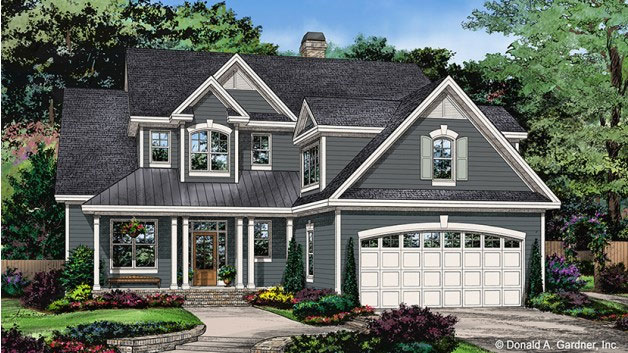 Dormers and a porch give this family home country flair, while the front-facing garage is easy to enter. The simple, open layout puts the great room at the center of activity, with access to the porch, the island kitchen, and the guest suite. Four more bedrooms rest upstairs, including the master suite and its spacious bathroom. Walk-in closets and a bonus room add storage space. See more images, information, and the floor plans.