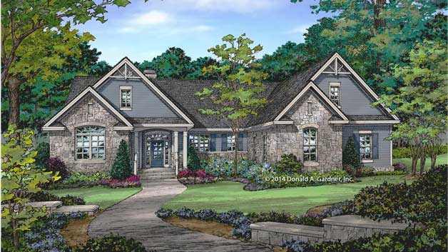 Touches of stone add to the curb appeal of this versatile one-story layout. Inside, the study can easily serve as a fourth bedroom with an adjoining full bath that also opens to the hallway. Secluded in the left wing, the master suite opens to the screen porch, where skylights create a bright sitting spot. The kitchen’s counters overlook both the open dining nook and the great room. If more space is needed, the bonus room (featuring more skylights) can be finished upstairs. See more images, information, and the floor plan.