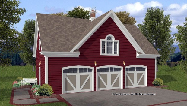 The apartment above the three-car garage would be perfect temporary quarters during construction of a permanent home. Later it could function as an in-law unit, nanny quarters, college student apartment, and so on. This design features an eat-in kitchen, a spacious family room, a bathroom, and a bedroom with a roomy closet. The laundry appliances are tucked beneath the stairs on the garage level with an optional laundry chute on the living level. See more images, information, and the floor plan.
