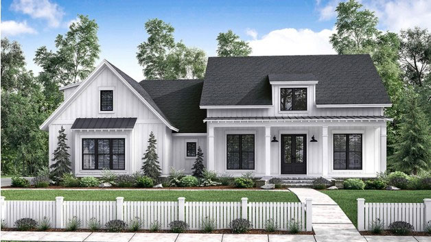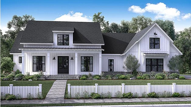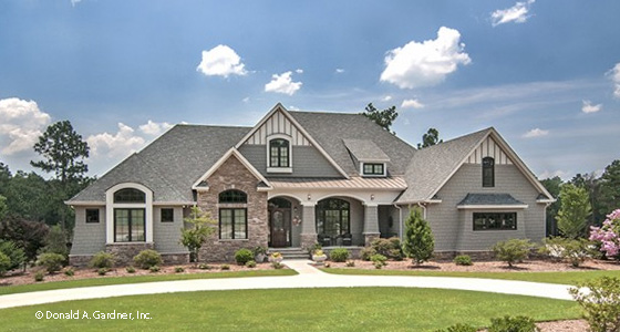 This sleek style features clean lines and an open layout. Front and rear porches add room for outdoor living, with French doors in the great room. A bonus suite upstairs offers finish-later space for guests. Don’t miss the master suite’s enormous walk-in closet. See more images, information, and the floor plan.