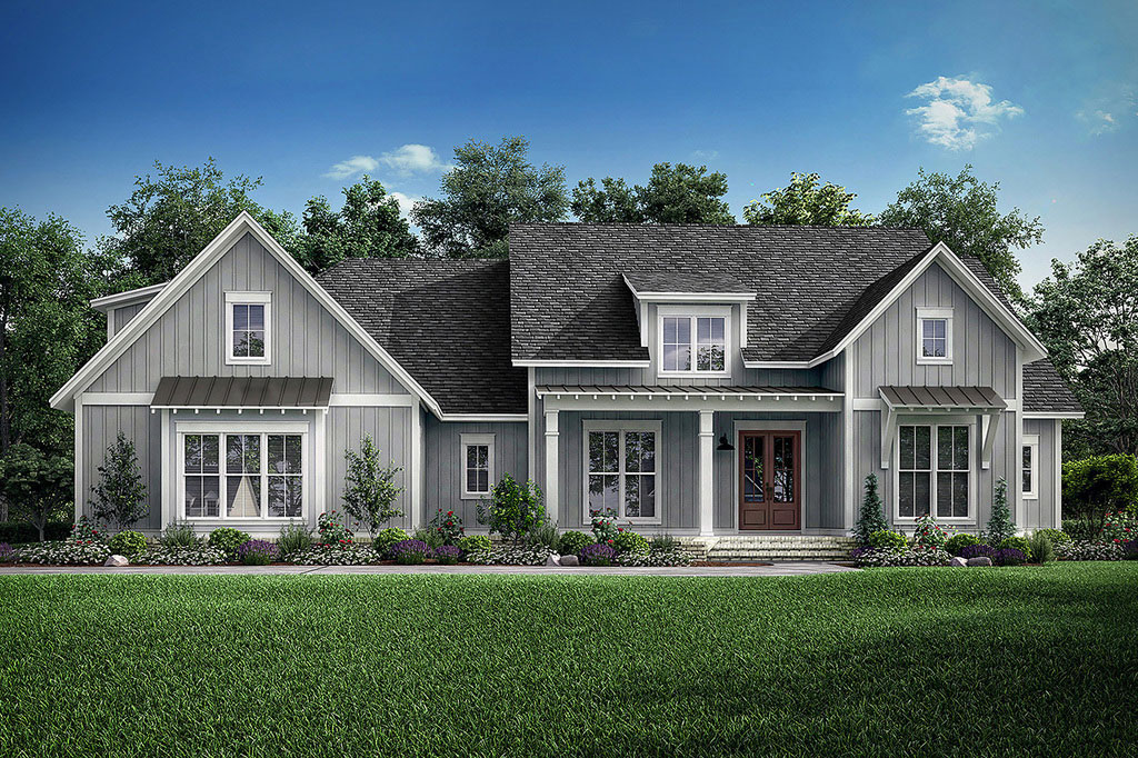 While it’s a bad idea to design for once-a-year-events like Christmas celebrations, a smart layout will easily flex to accommodate entertaining. And these days, the rise of multigenerational living means that a house plan with room for extended family members can carry wide appeal. Here, some standout farmhouse styles (the hot look of the moment) with clever floor plans.