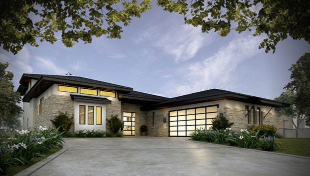 This sleek home wraps around a spacious side courtyard to provide plenty of outdoor living, even on a not-super-wide lot. The master suite and a secluded guest zone both reside on the main level, while kids will make the upper level (with two bedroom suites and a loft) their hangout upstairs. Other notable features include a wet bar in the great room and the large pantry that can hold enough groceries for a busy family. See more images, information, and the floor plans.