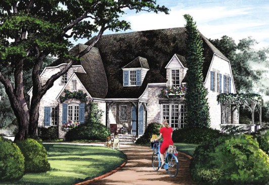 This lovely English cottage plan would enhance any neighborhood. With interesting roof lines, a side dining terrace covered by an arbor, graceful clipped gables, and other beautiful details, it recalls a past era of classic house design. The interior, however, is not a throwback to the past, with an open floor plan and plenty of modern amenities. With five bedrooms (the sizable fifth one sits downstairs with an attached bath, so kids don’t have the opportunity to get distracted walking through the home for a bathroom break), four baths, an open island kitchen, and a giant optional bonus room, this plan is a perfect fit for a large active family. Don’t miss the walk-in pantry, big closets, and abundant storage in the garage and upstairs. See more images, information, and the floor plan.