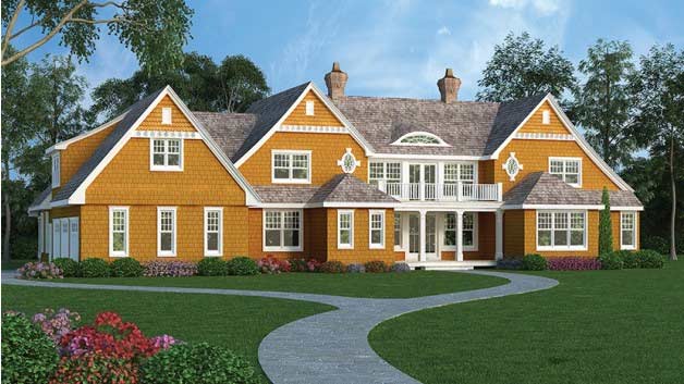 In the master wing, an out-of-the-ordinary arrangement provides privacy to two bedrooms that meet in an oversize bathroom. Three more bedrooms rest downstairs, along with a game room and wine cellar. A two-sided fireplace warms both the super-spacious great room and the dining room on the other side. The three-season porch is ready for all kinds of weather with a fireplace and disappearing walls. See more images, information, and the floor plan.