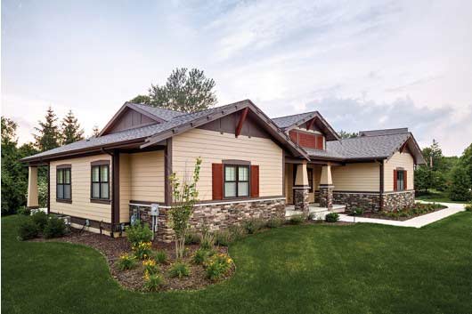 Designed by Visbeen Architects, this plan presents Craftsman curb appeal and a finished lower level. On the first floor, a sunroom connects to the master suite to serve as a private sitting (or snoring) room when desired. The bright dining room opens to a spacious covered patio. Downstairs, you’ll find a family room (with enough space for exercise equipment), two bedrooms, and even a craft room. See more images, information, and the floor plan.