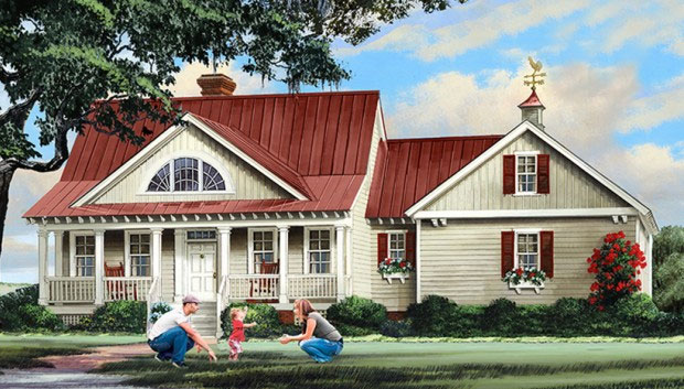 This family-friendly home combines old-fashioned charm with a practical, modern layout. The floor plan tucks the master suite on the right side for privacy, with a deluxe bathroom that includes a whirlpool tub, two sinks, and linen storage. Across the home, three more bedrooms share two baths. A snack bar makes it easy to serve up casual meals in the kitchen, with the bright breakfast nook (check out the lovely bay window) nearby. French doors open the great room to the screen porch. Upstairs, you’ll find tons of storage space and a finish-later bonus room. See more images, information, and the floor plans.