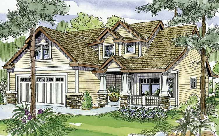 The master suite of this 2,091-square-foot home is easily accessed on the first floor and boasts two walk-in closets, two sinks, and a separate tub and shower (both with windows). An angled snack bar adds serious utility to the kitchen, which adjoins the vaulted breakfast nook and great room. The dining room could also serve as a den. Two secondary bedrooms upstairs share access to the large bonus room. See more images, information, and the floor plan.
