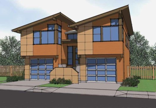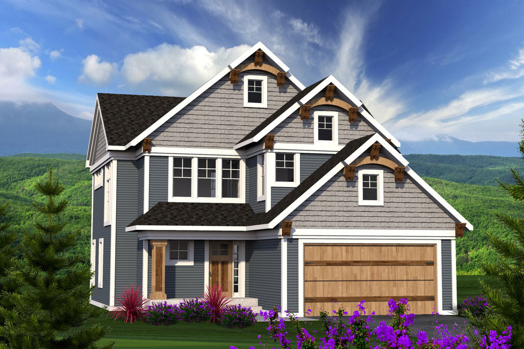 A striking facade makes this 36′ x 45′ design stand out. Buyers will appreciate the spacious great room, the casual dining room, and the kitchen’s snack peninsula. Upstairs, all three bedrooms boast walk-in closets. The master suite offers especially generous dimensions, along with double sinks in the private bathroom. A two-car garage is a nice selling point that entry-level buyers won’t always find on the existing-home market. See more images, information, and the floor plans.