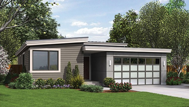 Simple yet bold, this contemporary design presents a modern layout with the kitchen at the heart. A wide island looks out to the vaulted living and dining areas, which open outside. The master suite features a large shower, two sinks, and a walk-in closet. Two more bedrooms (or an office and a bedroom) share a hall bath that boasts a big shower. See more images, information, and the floor plans.