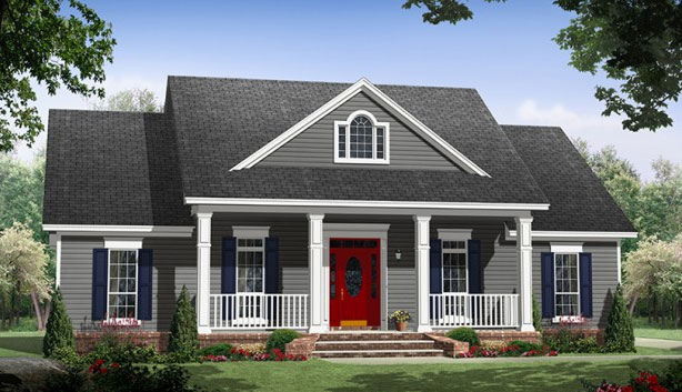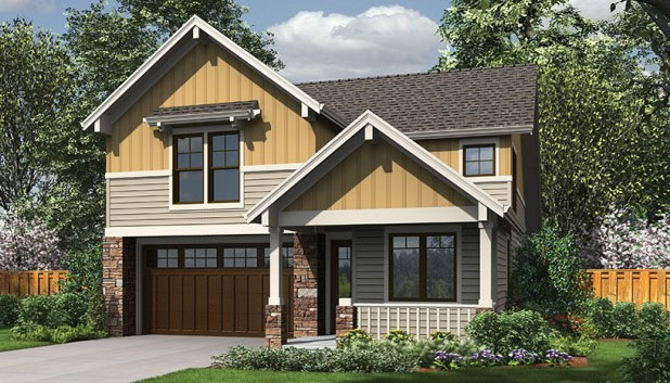 A bold mix of materials gives plenty of curb appeal to this plan, which will fit nicely on a compact lot. Inside, every square foot is used wisely, with good sightlines from the front door through to the back. The centrally located kitchen includes a snack bar and an open dining nook that replaces a formal dining room. Near the front, the den makes a great home office. Two sinks and a large shower add modern flair to the master suite upstairs, with the laundry nearby. Secondary bedrooms share a full bath. See more images, information, and the floor plans.